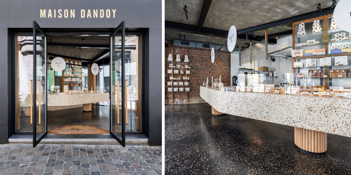 From the very first renovations carried out by Maison Dandoy, Terrazzo/granito was chosen as a central element in the design of the premises, and over the course of the projects it became a true signature of the shops. This trademark does not fail to attract attention and never ceases to seduce customers, ‘who are often caught taking photos of the shop,’ adds Julie Capiau.