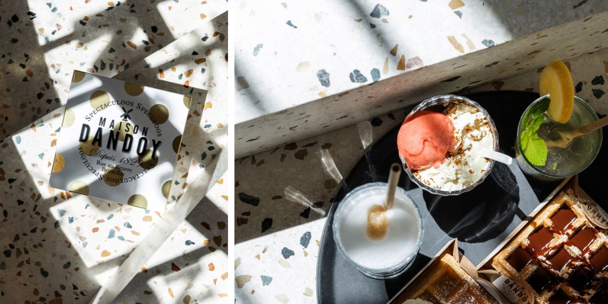From the very first renovations carried out by Maison Dandoy, Terrazzo/granito was chosen as a central element in the design of the premises, and over the course of the projects it became a true signature of the shops. This trademark does not fail to attract attention and never ceases to seduce customers, ‘who are often caught taking photos of the shop,’ adds Julie Capiau.