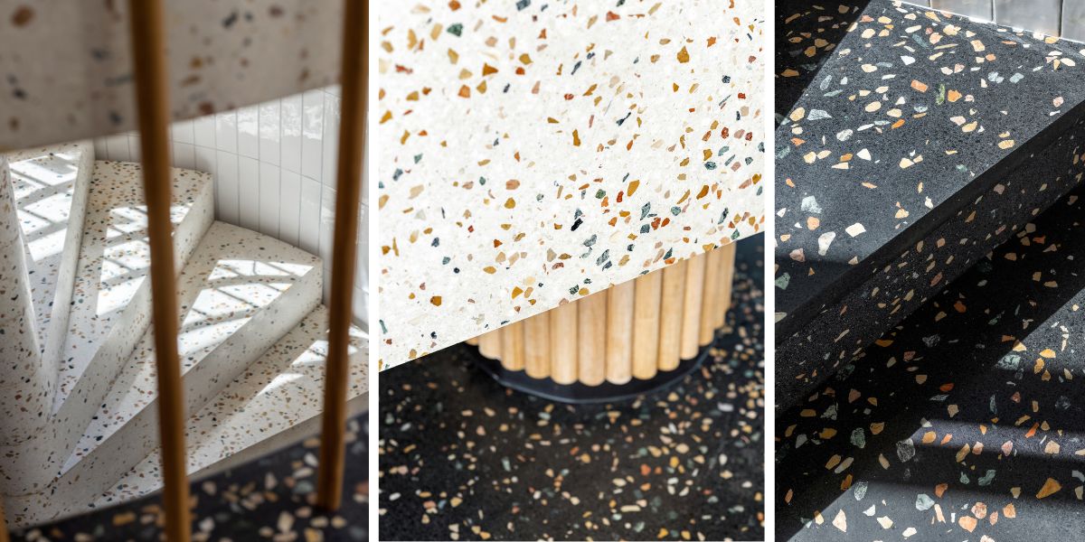D’abord uniquement utilisé pour la création d’un comptoir dans l’une des boutiques précédemment rénovée, l’équipe a voulu pour cette adresse-ci poursuivre l’exploration de ce matériau et le mettre encore plus en valeur. L’idée était aussi d’aller encore plus loin dans la personnalisation de ce revêtement et de tirer profit de son adaptabilité et de sa résistance en l’utilisant à plus grande échelle. Comptoir, escaliers, sols sur deux étages, toilettes et vasques : tous ces éléments seraient cette fois en Terrazzo.