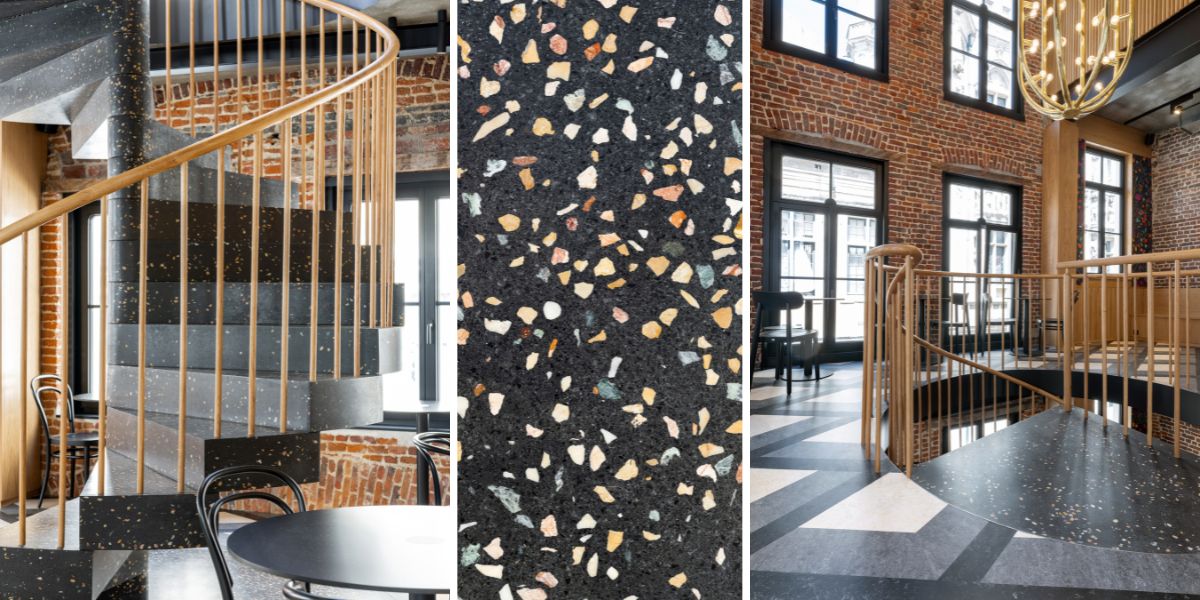 Le comptoir et le majestueux escalier central ont été réalisés avec un enduit BEALSTONE® blanc tandis que les sols ont une teinte noire. Olivier Hannaert précise qu’il a l’habitude de travailler ce matériau, car il préfère nettement ce système à d’autres alternatives pour la création de sols coulés. Il confie notamment que « le béton est en comparaison bien plus complexe à installer et qu’il engendre souvent des déceptions : fissures, bords pas nets et autres divers défauts. Le revêtement BEALSTONE®, ce sont des résines souples vraiment faciles à mélanger et très pratiques à poser. Cette solution offre donc un résultat garanti à la fois beau, propre et net. Sans compter que les choix sont infinis tant dans les couleurs que les grains, ce qui permet une grande personnalisation du produit. ». Il ajoute : « Et même si le Terrazzo est très tendance depuis quelques années, je pense qu’il ne passera pas de mode. Sa versatilité dans la manière de le mettre en valeur dans un intérieur et ses immenses possibilités en termes de personnalisation en font un matériau indémodable. ».