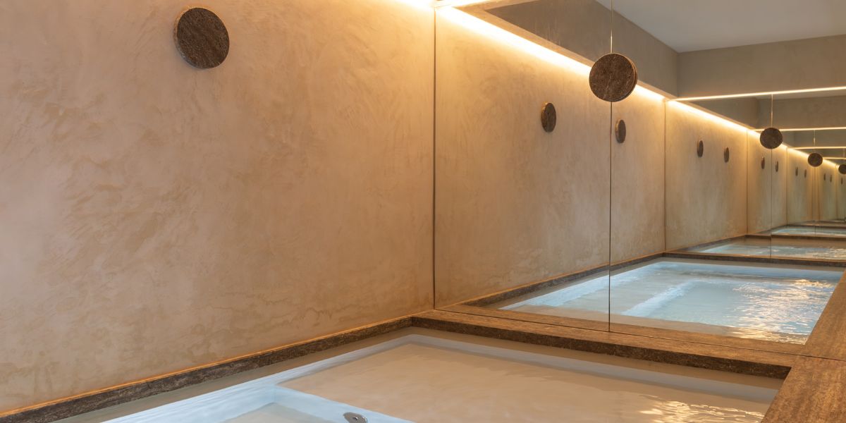 ドンテッティ氏は付け加えます。「このタイプのプロジェクトでは、顧客にMORTEX®マイクロモルタルを常に推奨しています。なぜなら、この製品は長期にわたる耐摩耗性に優れ、完璧な防水性を確保するからです。目地がないことも、スパの衛生管理において重要なポイントです。これにより、湿気の蓄積を防ぎ、清掃が容易になります。加えて、鉱物のような質感は触り心地も良く、この空間に求める雰囲気と一致しています。ベージュ/サンドの色合いと暗い石の組み合わせは、穏やかで包み込むような雰囲気をさらに感じさせます。」