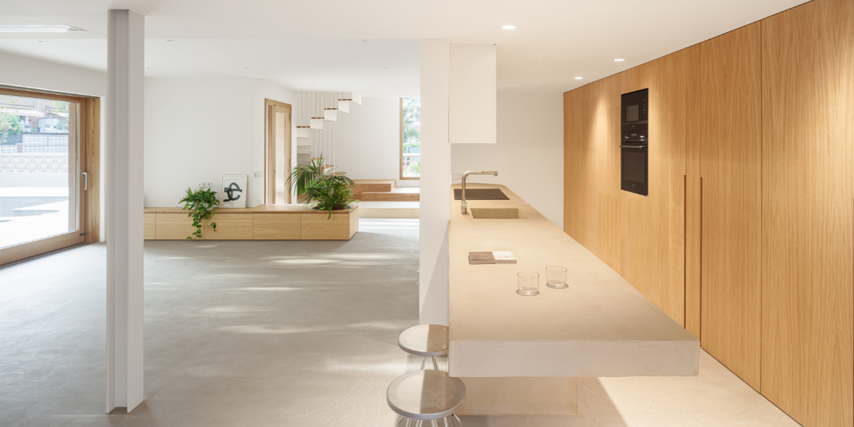 この連続性を表現するため、MORTEX®システムが、屋内と屋外の床材として採用されました。そのミネラル調で自然、かつシームレスな外観が、空間全体の視覚的な統一感に貢献しています。また、戦略的に配置された新しい窓の設置により、自然光の取り込みと空間の美しさをさらに強調しています。
