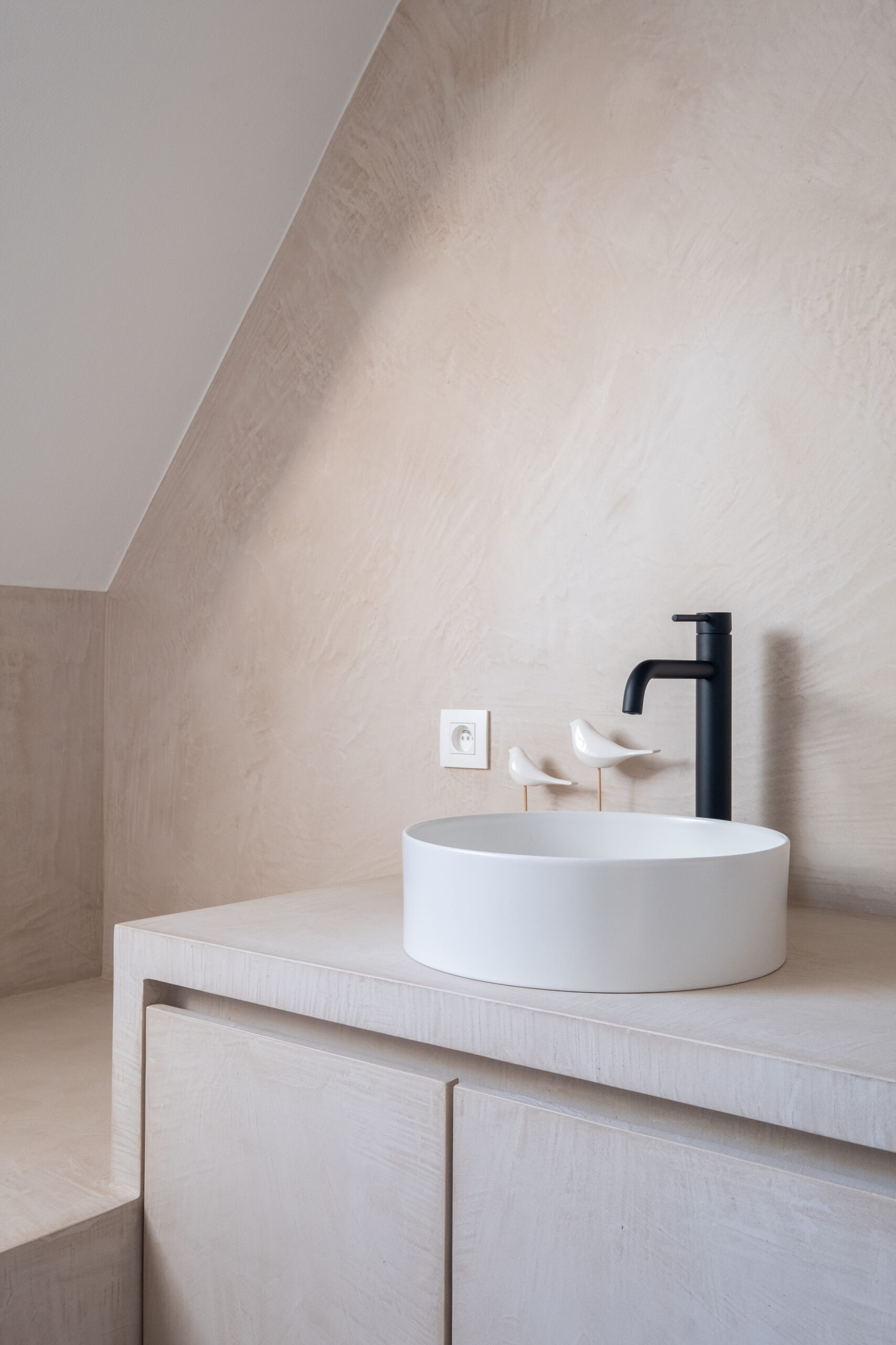 Als MORTEX®-minerale pleister voor de hele ruimte (vloeren, wanden, douche, wastafel…) wordt gebruikt, verandert deze de badkamer in een meeslepende, zachte en eigentijdse ruimte.