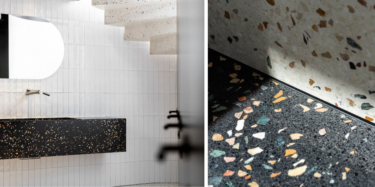 Aanvankelijk werd het alleen gebruikt voor een toonbank in een van de eerder gerenoveerde winkels, maar het team wilde dit materiaal verder verkennen en het op dit adres nog beter tot zijn recht laten komen. Het idee was ook om nog verder te gaan in het personaliseren van deze vloer en te genieten van zijn aanpassingsvermogen en weerstand door het op grotere schaal te gebruiken. Balies, trappen, vloeren met twee verdiepingen, toiletten en wastafels: al deze elementen zouden deze keer in Terrazzo worden uitgevoerd.